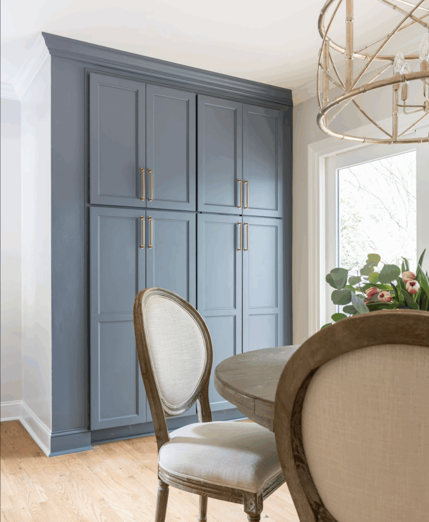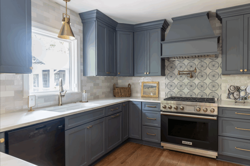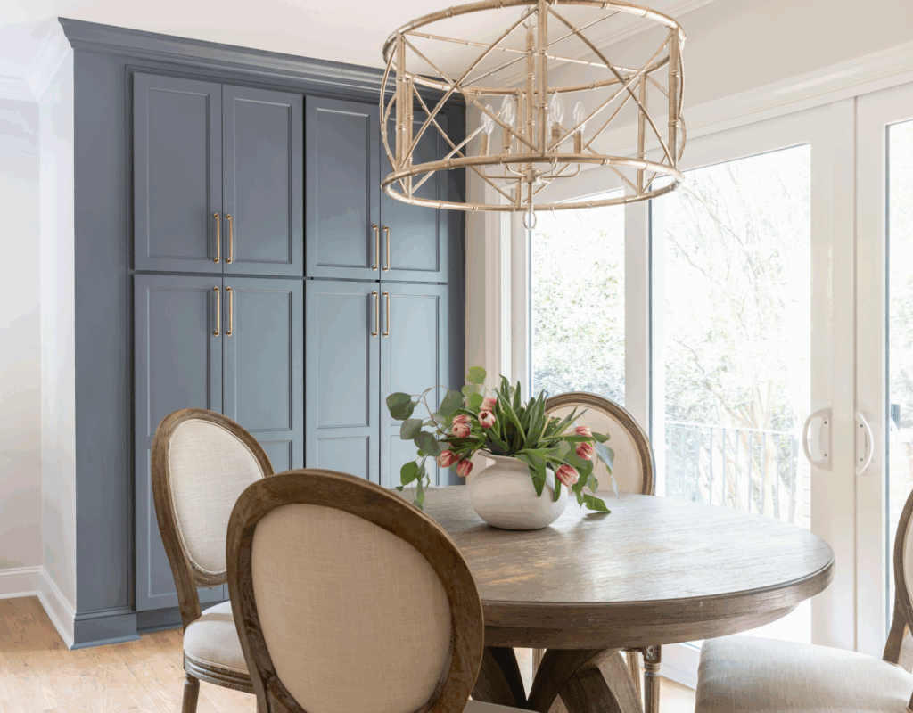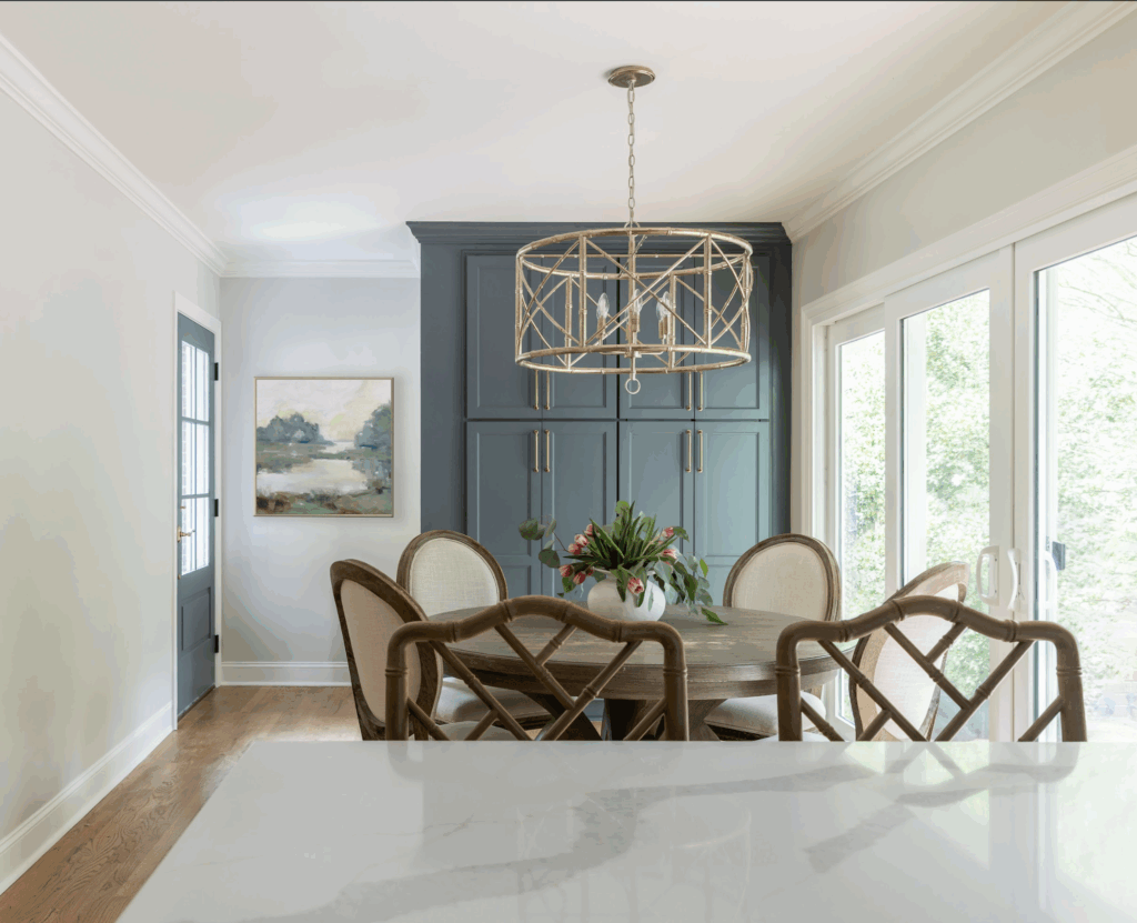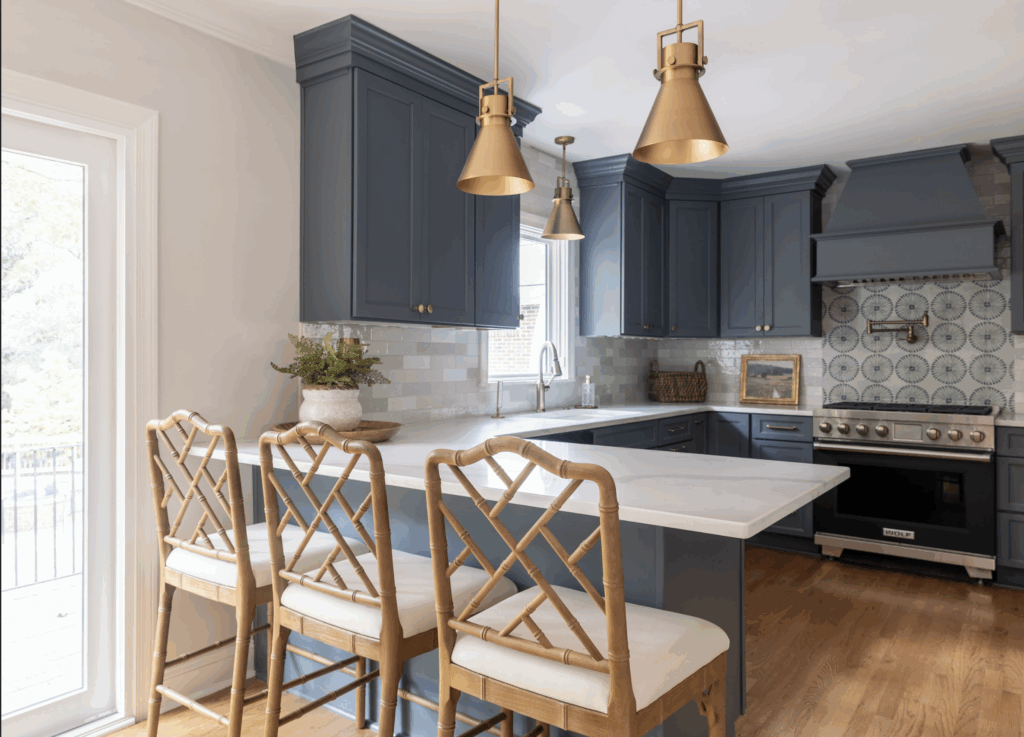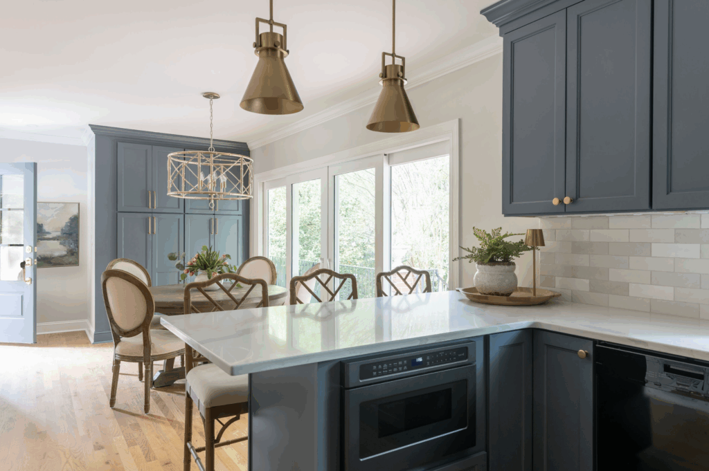 Our client envisioned a classic kitchen with beautiful blue cabinetry and light countertops, and that vision became the foundation of our design. We started by removing the ceiling fan in the center of the kitchen and replacing it with elegant pendants that complement the cabinet hardware, instantly bringing warmth and sophistication to the space.