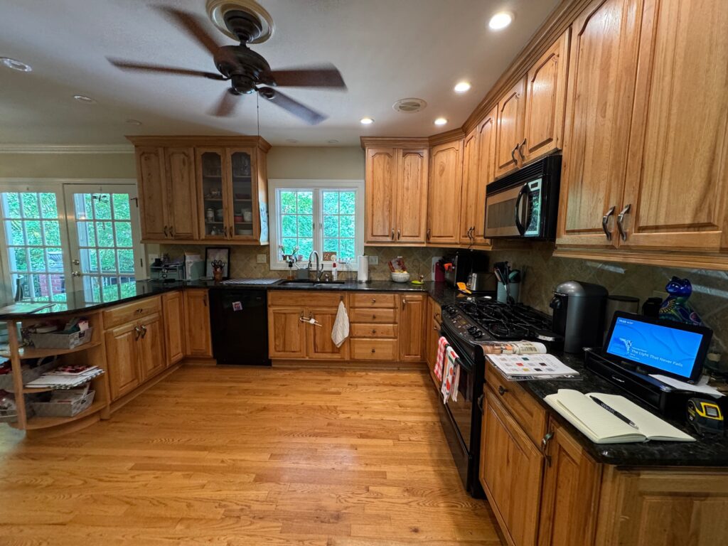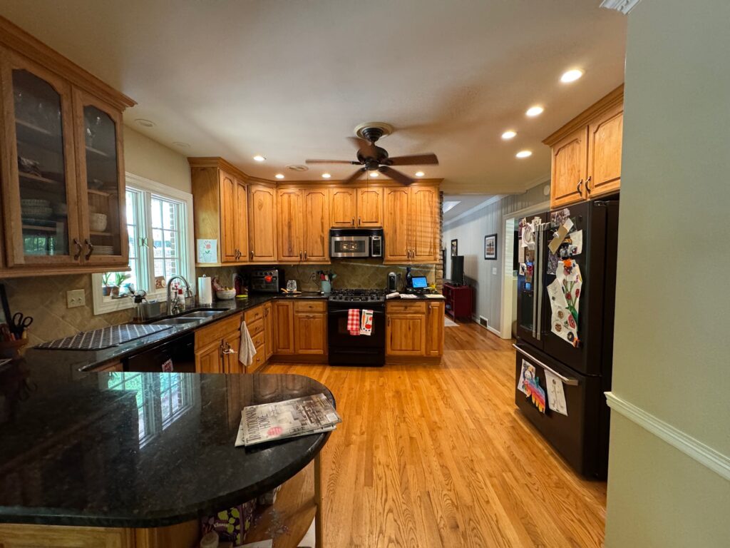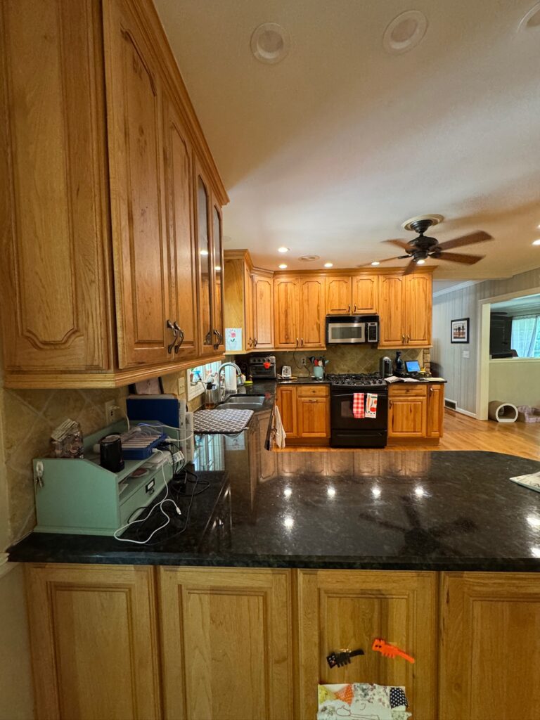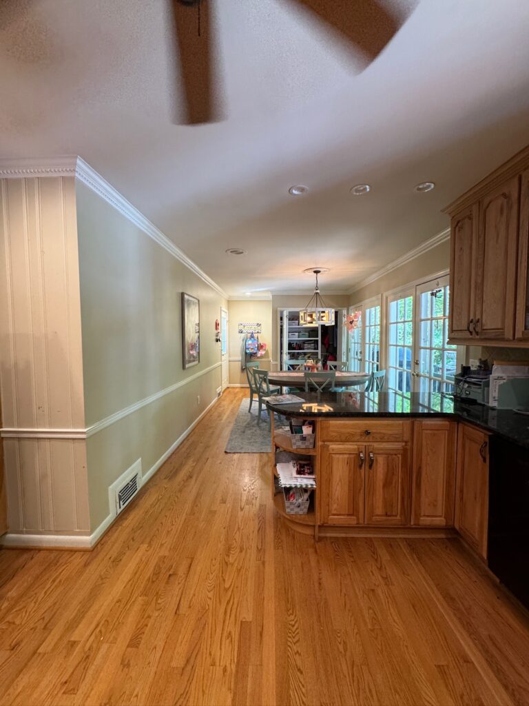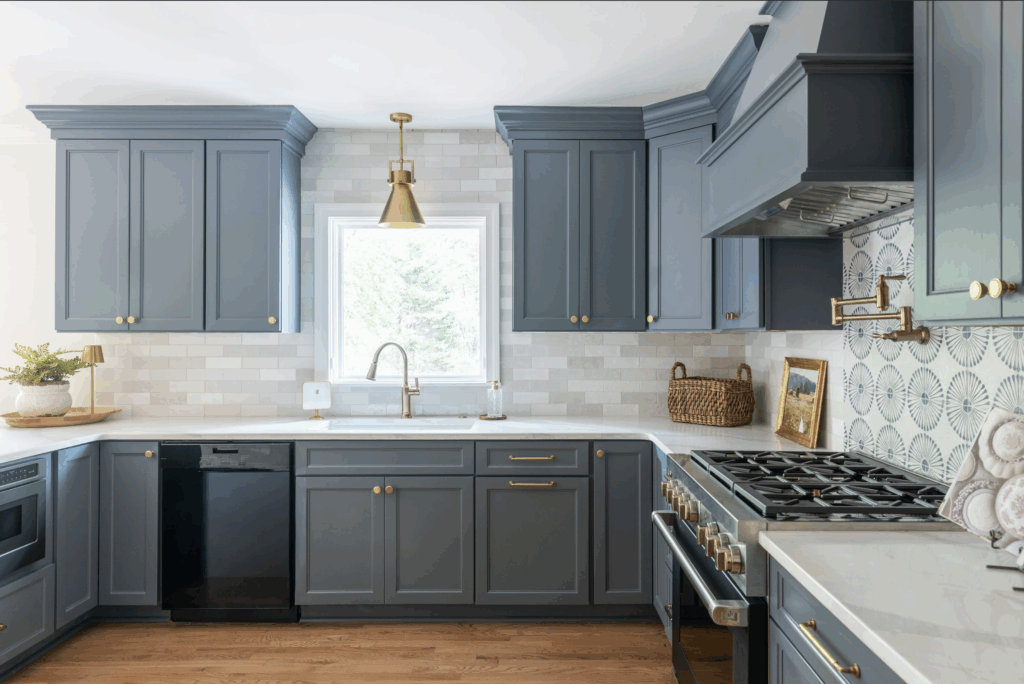 Our client envisioned a classic kitchen with beautiful blue cabinetry and light countertops, and that vision became the foundation of our design. We started by removing the ceiling fan in the center of the kitchen and replacing it with elegant pendants that complement the cabinet hardware, instantly bringing warmth and sophistication to the space.
