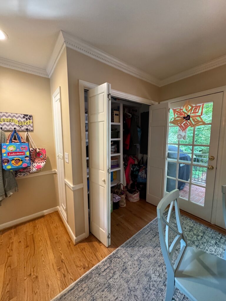 Storage was another top priority. What was once a basic closet was transformed into a custom built-in pantry with sliding pull-outs on one side and a coat and backpack closet on the other—both concealed behind matching cabinetry doors for a seamless, built-in look.
