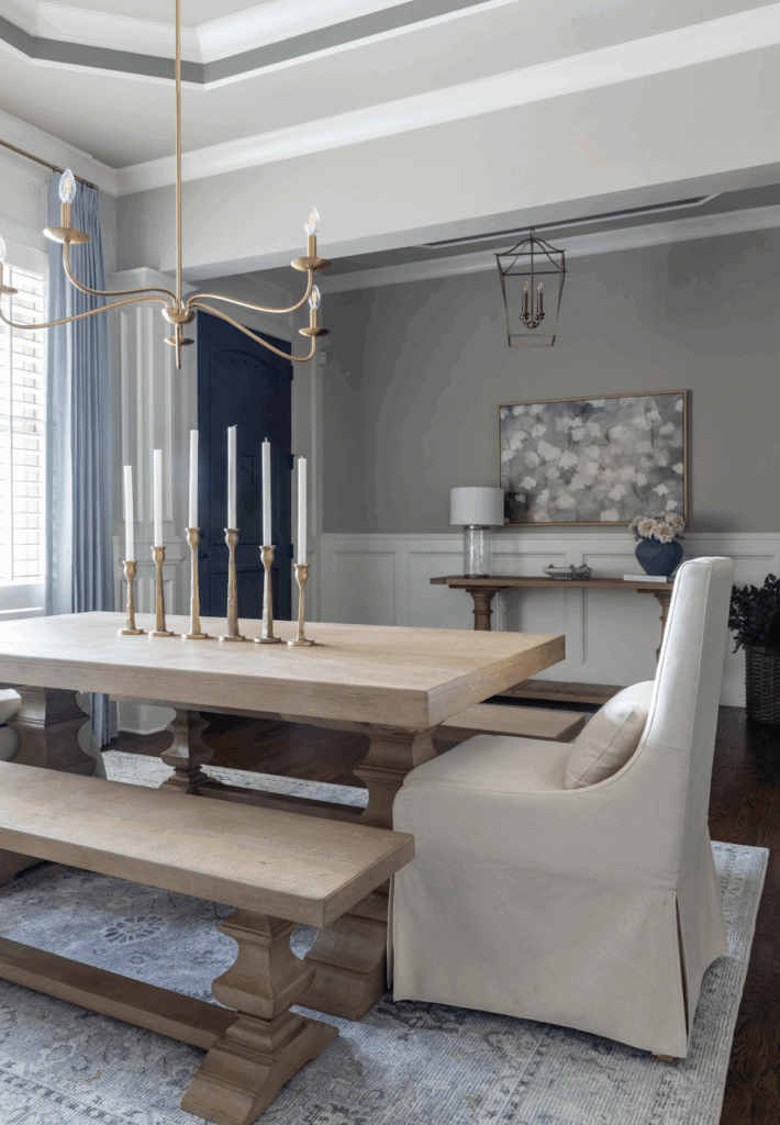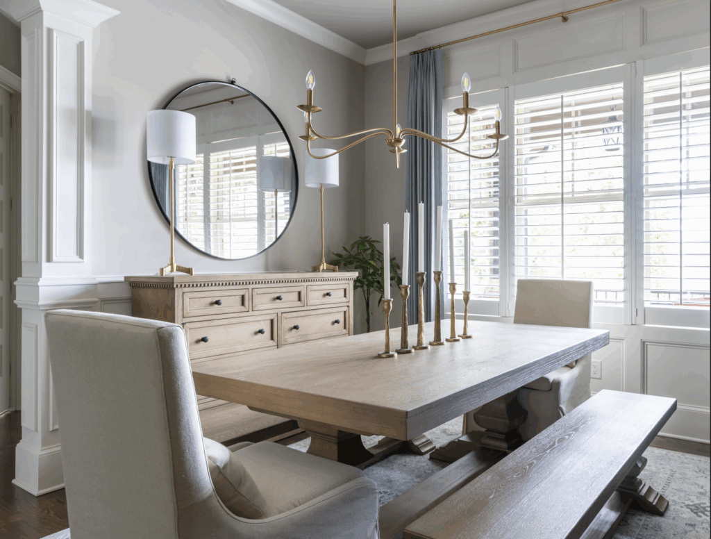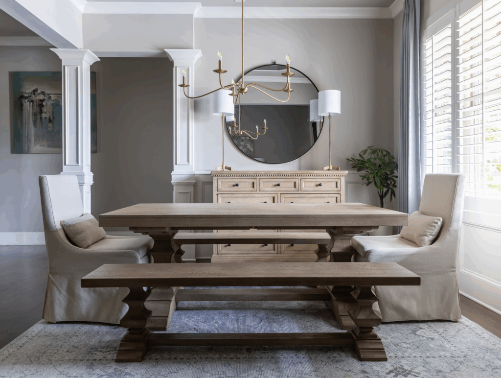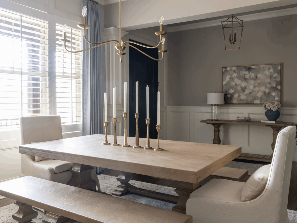 The finished dining room features a rectangular table with two benches and upholstered end chairs—perfect for both everyday meals and family gatherings. The lighter wood tones, layered textiles, and custom window treatments create a timeless, welcoming design that feels personal and lived-in.