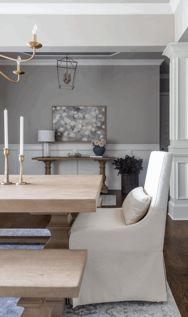 To ground the design, we layered in a large area rug that defines the dining area and adds comfort underfoot. We chose a light wood dining table and buffet to contrast beautifully with the home’s dark-stained hardwood floors.