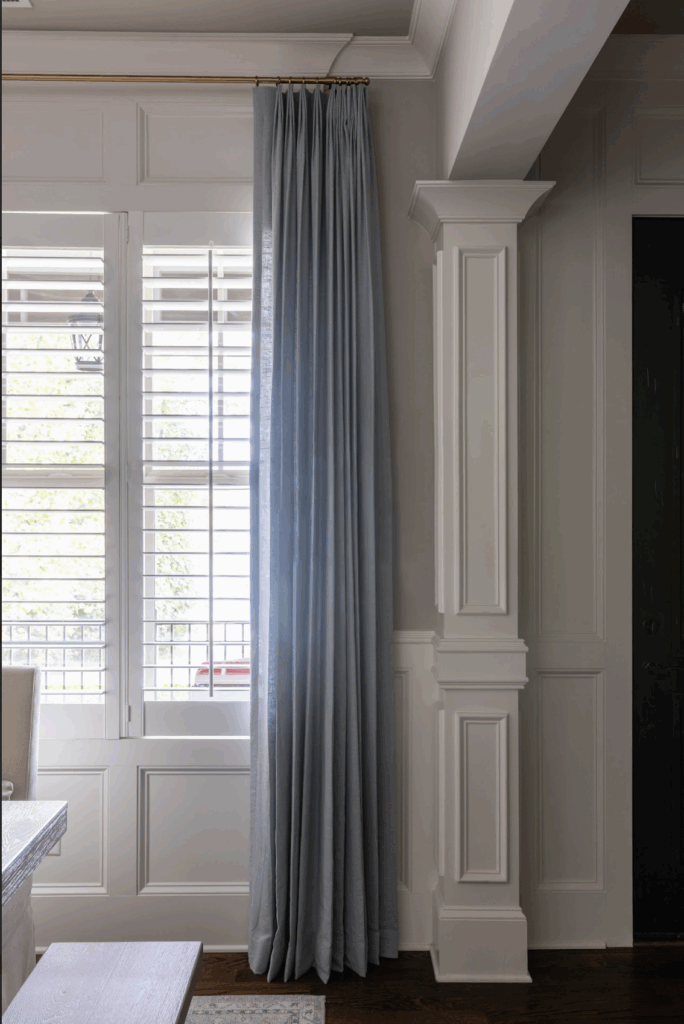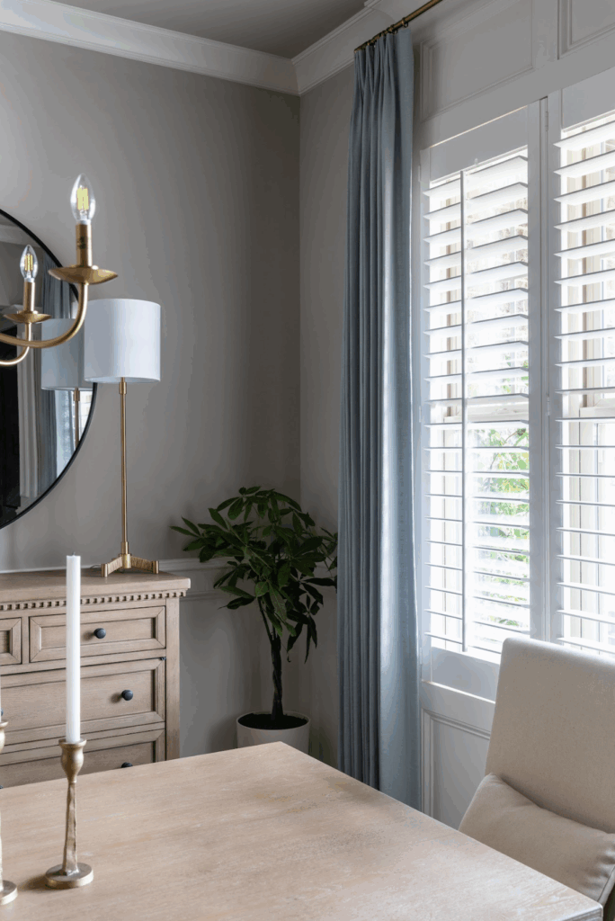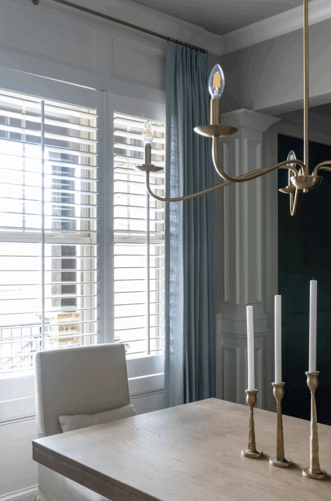 We started by focusing on the foundation: light and texture. We installed plantation shutters for privacy and architectural character, then flanked them with custom blue linen draperies to add softness and color. Updating the dining fixture brought a more welcoming glow to the room—instantly making the space feel lighter and more open.